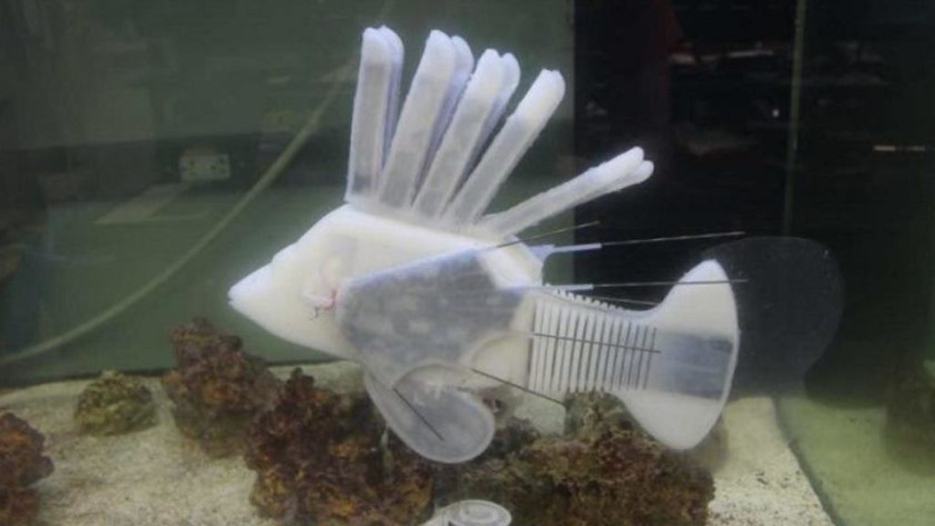 En lugar de usar el fluido hidráulico convencional, que normalmente circula alrededor de las máquinas para mover sus partes, el equipo de Shepherd utilizó un fluido de batería que alimenta al robot y también una bomba para mover las aletas, haciendo que los peces naden.